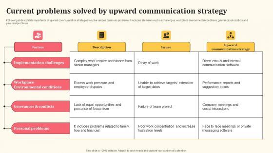 Following slide exhibits importance of upward communication strategies to solve various business problems. It includes elements such as challenges, workplace environmental conditions, grievances and conflicts and personal problems. Get a simple yet stunning designed Current Problems Solved By Upward Communication Strategy Ppt PowerPoint Presentation Diagram Images PDF. It is the best one to establish the tone in your meetings. It is an excellent way to make your presentations highly effective. So, download this PPT today from Slidegeeks and see the positive impacts. Our easy to edit Current Problems Solved By Upward Communication Strategy Ppt PowerPoint Presentation Diagram Images PDF can be your go to option for all upcoming conferences and meetings. So, what are you waiting for Grab this template today.