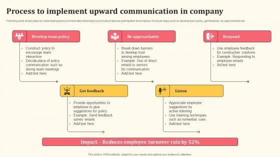 Following slide shows steps to implement upward communication that helps to promote employee participation at workplace. It include steps such as develop team policy, get feedback, be approachable etc. Slidegeeks has constructed Process To Implement Upward Communication In Company Ppt PowerPoint Presentation File Slides PDF after conducting extensive research and examination. These presentation templates are constantly being generated and modified based on user preferences and critiques from editors. Here, you will find the most attractive templates for a range of purposes while taking into account ratings and remarks from users regarding the content. This is an excellent jumping off point to explore our content and will give new users an insight into our top notch PowerPoint Templates.