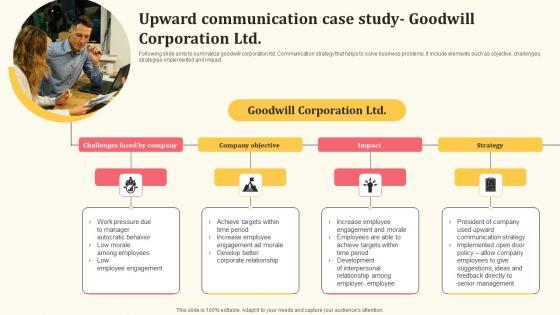 Following slide aims to summarize goodwill corporation ltd. Communication strategy that helps to solve business problems. It include elements such as objective, challenges, strategies implemented and impact. Boost your pitch with our creative Upward Communication Case Study Goodwill Corporation Ltd Ppt PowerPoint Presentation File Icon PDF. Deliver an awe-inspiring pitch that will mesmerize everyone. Using these presentation templates you will surely catch everyones attention. You can browse the ppts collection on our website. We have researchers who are experts at creating the right content for the templates. So you do not have to invest time in any additional work. Just grab the template now and use them.