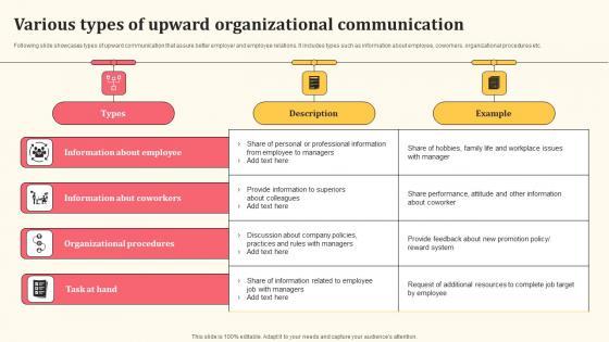 Following slide showcases types of upward communication that assure better employer and employee relations. It includes types such as information about employee, coworkers, organizational procedures etc. This modern and well-arranged Various Types Of Upward Organizational Communication Detailed Personnel Professional Pdf provides lots of creative possibilities. It is very simple to customize and edit with the Powerpoint Software. Just drag and drop your pictures into the shapes. All facets of this template can be edited with Powerpoint no extra software is necessary. Add your own material, put your images in the places assigned for them, adjust the colors, and then you can show your slides to the world, with an animated slide included. Following slide showcases types of upward communication that assure better employer and employee relations. It includes types such as information about employee, coworkers, organizational procedures etc.