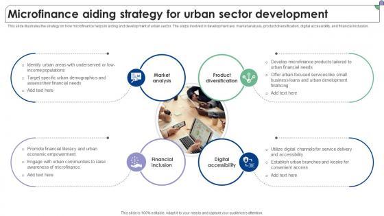 This slide illustrates the strategy on how microfinance helps in aiding and development of urban sector. The steps involved in development are market analysis, product diversification, digital accessibility, and financial inclusion. The best PPT templates are a great way to save time, energy, and resources. Slidegeeks have 100 percent editable powerpoint slides making them incredibly versatile. With these quality presentation templates, you can create a captivating and memorable presentation by combining visually appealing slides and effectively communicating your message. Download Microfinance Aiding Strategy For Urban Sector Development Complete Guide To Microfinance Fin SS V from Slidegeeks and deliver a wonderful presentation. This slide illustrates the strategy on how microfinance helps in aiding and development of urban sector. The steps involved in development are market analysis, product diversification, digital accessibility, and financial inclusion.