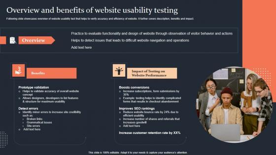 Following slide showcases overview of website usability test that helps to verify accuracy and efficiency of website. It further covers description, benefits and impact. Slidegeeks has constructed Overview And Benefits Of Website Usability Testing Step By Step Guide Structure PDF after conducting extensive research and examination. These presentation templates are constantly being generated and modified based on user preferences and critiques from editors. Here, you will find the most attractive templates for a range of purposes while taking into account ratings and remarks from users regarding the content. This is an excellent jumping-off point to explore our content and will give new users an insight into our top-notch PowerPoint Templates. Following slide showcases overview of website usability test that helps to verify accuracy and efficiency of website. It further covers description, benefits and impact.