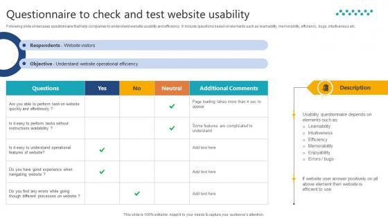 Following slide showcases questionnaire that help companies to understand website usability and efficiency. It include questions based on elements such as learnability, memorability, efficiency, bugs, intuitiveness etc. There are so many reasons you need a Complete Guide To Launch Questionnaire To Check And Test Website Usability. The first reason is you can not spend time making everything from scratch, Thus, Slidegeeks has made presentation templates for you too. You can easily download these templates from our website easily. Following slide showcases questionnaire that help companies to understand website usability and efficiency. It include questions based on elements such as learnability, memorability, efficiency, bugs, intuitiveness etc.