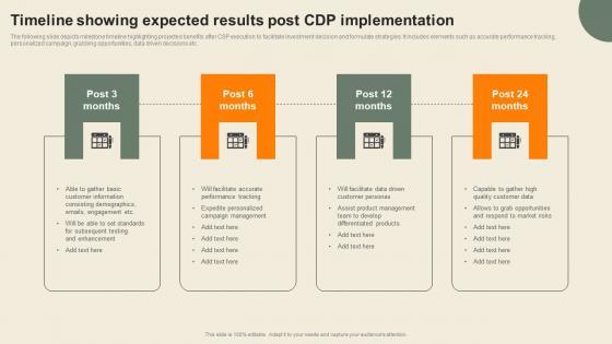 The following slide depicts milestone timeline highlighting projected benefits after CSP execution to facilitate investment decision and formulate strategies. It includes elements such as accurate performance tracking, personalized campaign, grabbing opportunities, data driven decisions etc. Want to ace your presentation in front of a live audience Our Timeline Showing Expected Results Post Usability Of CDP Software Tool Infographics Pdf can help you do that by engaging all the users towards you. Slidegeeks experts have put their efforts and expertise into creating these impeccable powerpoint presentations so that you can communicate your ideas clearly. Moreover, all the templates are customizable, and easy-to-edit and downloadable. Use these for both personal and commercial use. The following slide depicts milestone timeline highlighting projected benefits after CSP execution to facilitate investment decision and formulate strategies. It includes elements such as accurate performance tracking, personalized campaign, grabbing opportunities, data driven decisions etc.