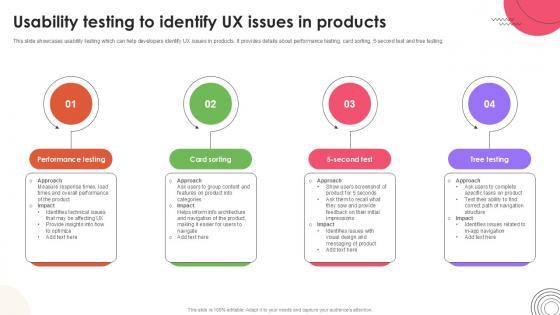 This slide showcases usability testing which can help developers identify UX issues in products. It provides details about performance testing, card sorting, 5-second test and tree testing.Here you can discover an assortment of the finest PowerPoint and Google Slides templates. With these templates, you can create presentations for a variety of purposes while simultaneously providing your audience with an eye-catching visual experience. Download Usability Testing To Identify User Experience Design Ppt Presentation Strategy SS V to deliver an impeccable presentation. These templates will make your job of preparing presentations much quicker, yet still, maintain a high level of quality. Slidegeeks has experienced researchers who prepare these templates and write high-quality content for you. Later on, you can personalize the content by editing the Usability Testing To Identify User Experience Design Ppt Presentation Strategy SS V. This slide showcases usability testing which can help developers identify UX issues in products. It provides details about performance testing, card sorting, 5-second test and tree testing.