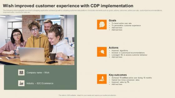 The following slide highlights how Wishs shopping application achieved growth by adopting customer data platform. It includes elements such as goals, actions, outcomes, active user rate, customized recommendations, improved sales, conversion rates etc. Do you have an important presentation coming up Are you looking for something that will make your presentation stand out from the rest Look no further than Wish Improved Customer Experience With Usability Of CDP Software Tool Pictures Pdf. With our professional designs, you can trust that your presentation will pop and make delivering it a smooth process. And with Slidegeeks, you can trust that your presentation will be unique and memorable. So why wait Grab Wish Improved Customer Experience With Usability Of CDP Software Tool Pictures Pdf today and make your presentation stand out from the rest The following slide highlights how Wishs shopping application achieved growth by adopting customer data platform. It includes elements such as goals, actions, outcomes, active user rate, customized recommendations, improved sales, conversion rates etc.