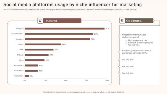 This slide provide information about platform usage by micro marketing influencer while promoting product and services. It includes elements such as Instagram, Facebook, YouTube, twitter etc. Showcasing this set of slides titled Social Media Platforms Usage By Niche Influencer For Marketing Introduction Pdf. The topics addressed in these templates are Platforms, Highlights, Marketing. All the content presented in this PPT design is completely editable. Download it and make adjustments in color, background, font etc. as per your unique business setting. This slide provide information about platform usage by micro marketing influencer while promoting product and services. It includes elements such as Instagram, Facebook, YouTube, twitter etc.