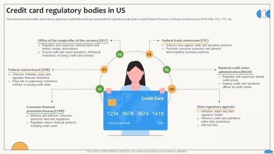 This slide shows information about various agencies or authorities which are responsible for regulating credit cards in United States of America. It includes bodies such as CFPB, FRB, OCC, FTC, etc. Crafting an eye-catching presentation has never been more straightforward. Let your presentation shine with this tasteful yet straightforward Credit Card Regulatory Bodies In US Swipe Smartly A Practical Guide Fin SS V template. It offers a minimalistic and classy look that is great for making a statement. The colors have been employed intelligently to add a bit of playfulness while still remaining professional. Construct the ideal Credit Card Regulatory Bodies In US Swipe Smartly A Practical Guide Fin SS V that effortlessly grabs the attention of your audience Begin now and be certain to wow your customers This slide shows information about various agencies or authorities which are responsible for regulating credit cards in United States of America. It includes bodies such as CFPB, FRB, OCC, FTC, etc.