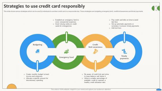 This slide shows various strategies which can be used by individuals to use their credit card in a responsible way. These strategies are budgeting, emergency fund, credit limit awareness and timely payments. Do you have an important presentation coming up Are you looking for something that will make your presentation stand out from the rest Look no further than Strategies To Use Credit Card Responsibly Swipe Smartly A Practical Guide Fin SS V. With our professional designs, you can trust that your presentation will pop and make delivering it a smooth process. And with Slidegeeks, you can trust that your presentation will be unique and memorable. So why wait Grab Strategies To Use Credit Card Responsibly Swipe Smartly A Practical Guide Fin SS V today and make your presentation stand out from the rest This slide shows various strategies which can be used by individuals to use their credit card in a responsible way. These strategies are budgeting, emergency fund, credit limit awareness and timely payments.