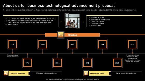 The following slide showcases the complete overview of technology modernization proposal. It covers information about company details such as founded in, headquarter, CEO, CFO, timeline, mission and vision statement. Elevate your presentations with our intuitive About Us For Business Technological Advancement Proposal Formats Pdf template. Whether you are delivering a pitch, sharing data, or presenting ideas, our visually-stunning single-slide PPT template is the perfect tool to captivate your audience. With 100 percent editable features and a user-friendly interface, creating professional presentations has never been easier. Download now and leave a lasting impression. The following slide showcases the complete overview of technology modernization proposal. It covers information about company details such as founded in, headquarter, CEO, CFO, timeline, mission and vision statement.