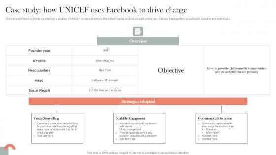 This slide provides insight into the strategies adopted by UNICEF to raise donations. The slide includes details such as founded year, website, headquarters, social reach, objective and techniques.Slidegeeks is here to make your presentations a breeze with Case Study How Unicef Uses Facebook To Drive Change Efficient Nonprofit Marketing Designs Pdf With our easy-to-use and customizable templates, you can focus on delivering your ideas rather than worrying about formatting. With a variety of designs to choose from, you are sure to find one that suits your needs. And with animations and unique photos, illustrations, and fonts, you can make your presentation pop. So whether you are giving a sales pitch or presenting to the board, make sure to check out Slidegeeks first. This slide provides insight into the strategies adopted by UNICEF to raise donations. The slide includes details such as founded year, website, headquarters, social reach, objective and techniques.