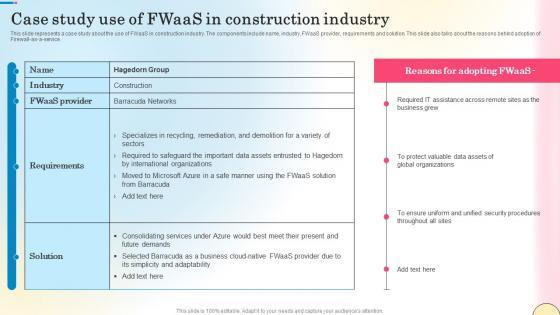 This slide represents a case study about the use of FWaaS in construction industry. The components include name, industry, FWaaS provider, requirements and solution. This slide also talks about the reasons behind adoption of Firewall-as-a-service. Do you have an important presentation coming up Are you looking for something that will make your presentation stand out from the rest Look no further than Case Study Use Of Fwaas In Construction Industry Network Security Guidelines Pdf. With our professional designs, you can trust that your presentation will pop and make delivering it a smooth process. And with Slidegeeks, you can trust that your presentation will be unique and memorable. So why wait Grab Case Study Use Of Fwaas In Construction Industry Network Security Guidelines Pdf today and make your presentation stand out from the rest This slide represents a case study about the use of FWaaS in construction industry. The components include name, industry, FWaaS provider, requirements and solution. This slide also talks about the reasons behind adoption of Firewall-as-a-service.