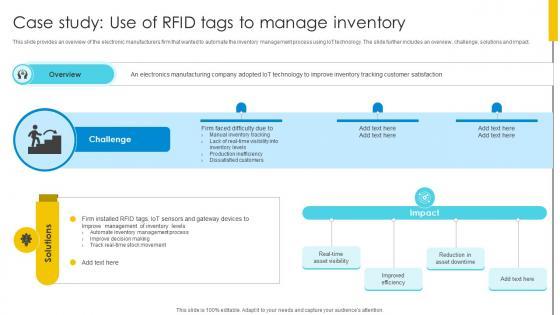 This slide provides an overview of the electronic manufacturers firm that wanted to automate the inventory management process using IoT technology. The slide further includes an overview, challenge, solutions and impact. Make sure to capture your audiences attention in your business displays with our gratis customizable Case Study Use Of RFID Tags To Manage Inventory Optimizing Inventory Management IoT SS V. These are great for business strategies, office conferences, capital raising or task suggestions. If you desire to acquire more customers for your tech business and ensure they stay satisfied, create your own sales presentation with these plain slides. This slide provides an overview of the electronic manufacturers firm that wanted to automate the inventory management process using IoT technology. The slide further includes an overview, challenge, solutions and impact.