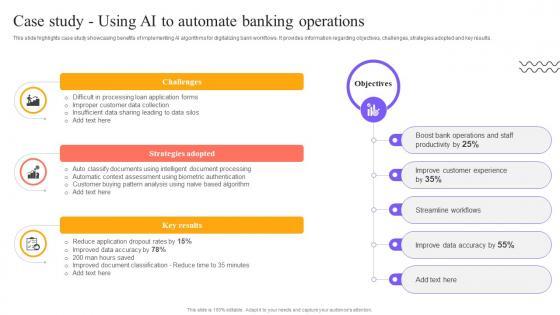 Slidegeeks has constructed Digitalising Customer Onboarding Case Study Using Ai To Automate Banking Operations after conducting extensive research and examination. These presentation templates are constantly being generated and modified based on user preferences and critiques from editors. Here, you will find the most attractive templates for a range of purposes while taking into account ratings and remarks from users regarding the content. This is an excellent jumping-off point to explore our content and will give new users an insight into our top-notch PowerPoint Templates. This slide will present a detailed case study on the transformative impact of integrating AI algorithms into banking operations to digitalize the customer onboarding process. The slide outlines the objectives in terms of operational efficiency and customer experience, the challenges in traditional onboarding workflows, innovative strategies adopted using AI, and measurable key results achieved.