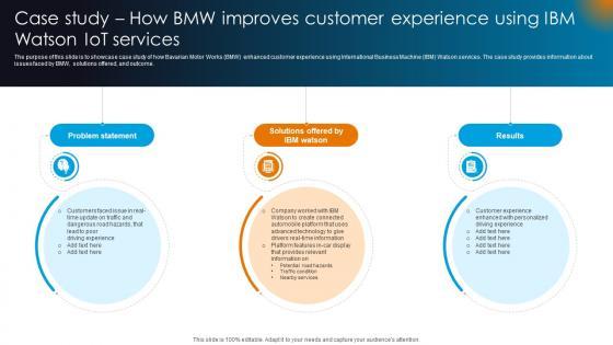 The purpose of this slide is to showcase case study of how Bavarian Motor Works BMW enhanced customer experience using International Business Machine IBM Watson services. The case study provides information about issues faced by BMW, solutions offered, and outcome. From laying roadmaps to briefing everything in detail, our templates are perfect for you. You can set the stage with your presentation slides. All you have to do is download these easy-to-edit and customizable templates. Integrating AI With IoT Case Study How Bmw Improves Customer Experience Using Ibm Watson IoT SS V will help you deliver an outstanding performance that everyone would remember and praise you for. Do download this presentation today. The purpose of this slide is to showcase case study of how Bavarian Motor Works BMW enhanced customer experience using International Business Machine IBM Watson services. The case study provides information about issues faced by BMW, solutions offered, and outcome.