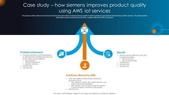 The purpose of this slide is to showcase how Siemens Automation company improve quality of various products using Amazon Web Services AWS services. The slide provides information about issues faced by Siemens, solutions offered by AWS, and result. Do you have an important presentation coming up Are you looking for something that will make your presentation stand out from the rest Look no further than Integrating AI With IoT Case Study How Siemens Improves Product Quality Using Aws IoT SS V. With our professional designs, you can trust that your presentation will pop and make delivering it a smooth process. And with Slidegeeks, you can trust that your presentation will be unique and memorable. So why wait Grab Integrating AI With IoT Case Study How Siemens Improves Product Quality Using Aws IoT SS V today and make your presentation stand out from the rest The purpose of this slide is to showcase how Siemens Automation company improve quality of various products using Amazon Web Services AWS services. The slide provides information about issues faced by Siemens, solutions offered by AWS, and result.
