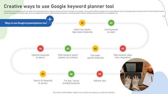 This slide covers techniques to use GKP tool to find keywords to improve search volumes for Google ad campaign. The purpose of this template is to provide different ways to leverage keyword planner tool to enhance performance of ads campaigns. It includes ways such as selecting low volume, high rewarded keywords, sorting keywords by intent, taking keywords ideas from competitors, etc. Explore a selection of the finest Google Ads Categories Creative Ways To Use Google Keyword Planner Tool MKT SS V here. With a plethora of professionally designed and pre-made slide templates, you can quickly and easily find the right one for your upcoming presentation. You can use our Google Ads Categories Creative Ways To Use Google Keyword Planner Tool MKT SS V to effectively convey your message to a wider audience. Slidegeeks has done a lot of research before preparing these presentation templates. The content can be personalized and the slides are highly editable. Grab templates today from Slidegeeks. This slide covers techniques to use GKP tool to find keywords to improve search volumes for Google ad campaign. The purpose of this template is to provide different ways to leverage keyword planner tool to enhance performance of ads campaigns. It includes ways such as selecting low volume, high rewarded keywords, sorting keywords by intent, taking keywords ideas from competitors, etc.
