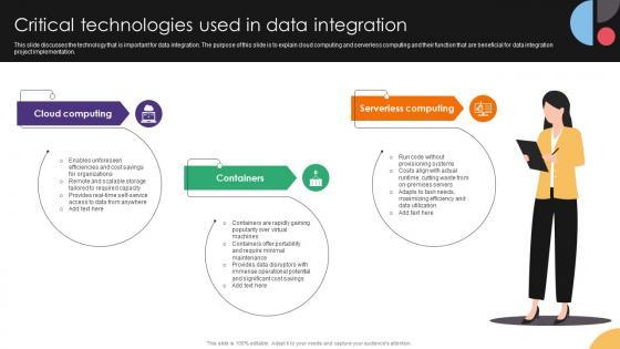 This slide discusses the technology that is important for data integration. The purpose of this slide is to explain cloud computing and serverless computing and their function that are beneficial for data integration project implementation. Slidegeeks is here to make your presentations a breeze with Critical Technologies Used In Data Integration Data Integration Strategies For Business With our easy-to-use and customizable templates, you can focus on delivering your ideas rather than worrying about formatting. With a variety of designs to choose from, you are sure to find one that suits your needs. And with animations and unique photos, illustrations, and fonts, you can make your presentation pop. So whether you are giving a sales pitch or presenting to the board, make sure to check out Slidegeeks first This slide discusses the technology that is important for data integration. The purpose of this slide is to explain cloud computing and serverless computing and their function that are beneficial for data integration project implementation.