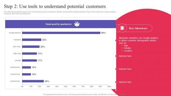 This slide showcases the various tools and channels used by marketers to identify and reach the potential audience. Major tools covered are Google Analytics, Facebook, SEO tools and CRM tools. From laying roadmaps to briefing everything in detail, our templates are perfect for you. You can set the stage with your presentation slides. All you have to do is download these easy-to-edit and customizable templates. Step 2 Use Tools To Understand Potential Customers Digital Promotional Campaign Formats Pdf will help you deliver an outstanding performance that everyone would remember and praise you for. Do download this presentation today. This slide showcases the various tools and channels used by marketers to identify and reach the potential audience. Major tools covered are Google Analytics, Facebook, SEO tools and CRM tools.