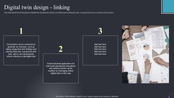 This slide depicts the linking phase of digital twin design that includes connecting various findings, parts, or equipment to get an overview of the product. If you are looking for a format to display your unique thoughts, then the professionally designed Digital Twin Design Linking Industrial Transformation Using Digital Twin Demonstration Pdf is the one for you. You can use it as a Google Slides template or a PowerPoint template. Incorporate impressive visuals, symbols, images, and other charts. Modify or reorganize the text boxes as you desire. Experiment with shade schemes and font pairings. Alter, share or cooperate with other people on your work. Download Digital Twin Design Linking Industrial Transformation Using Digital Twin Demonstration Pdf and find out how to give a successful presentation. Present a perfect display to your team and make your presentation unforgettable. This slide depicts the linking phase of digital twin design that includes connecting various findings, parts, or equipment to get an overview of the product.