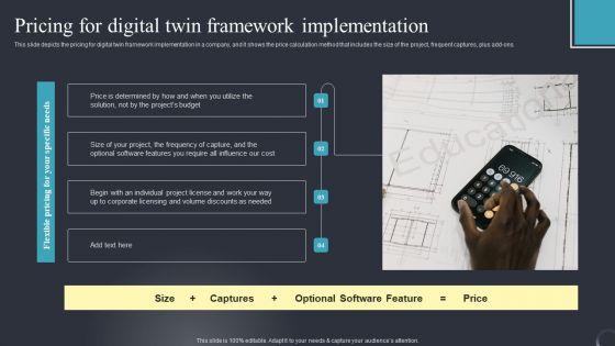 This slide depicts the pricing for digital twin framework implementation in a company, and it shows the price calculation method that includes the size of the project, frequent captures, plus add ons. Presenting this PowerPoint presentation, titled Pricing For Digital Twin Framework Industrial Transformation Using Digital Twin Designs Pdf, with topics curated by our researchers after extensive research. This editable presentation is available for immediate download and provides attractive features when used. Download now and captivate your audience. Presenting this Pricing For Digital Twin Framework Industrial Transformation Using Digital Twin Designs Pdf. Our researchers have carefully researched and created these slides with all aspects taken into consideration. This is a completely customizable Pricing For Digital Twin Framework Industrial Transformation Using Digital Twin Designs Pdf that is available for immediate downloading. Download now and make an impact on your audience. Highlight the attractive features available with our PPTs. This slide depicts the pricing for digital twin framework implementation in a company, and it shows the price calculation method that includes the size of the project, frequent captures, plus add ons.