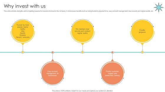This slide exhibits strengths and compelling reasons for investors to invest in the company. It showcases benefits such as being trusted by popular firms, easy account management, clear security and regular audits, etc. The best PPT templates are a great way to save time, energy, and resources. Slidegeeks have 100 percent editable powerpoint slides making them incredibly versatile. With these quality presentation templates, you can create a captivating and memorable presentation by combining visually appealing slides and effectively communicating your message. Download Why Invest With Us Email Management Technology Pitch Deck from Slidegeeks and deliver a wonderful presentation. This slide exhibits strengths and compelling reasons for investors to invest in the company. It showcases benefits such as being trusted by popular firms, easy account management, clear security and regular audits, etc.