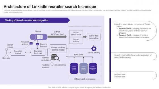 This slide demonstrates the working flow of LinkedIns recruiter search. The purpose of this slide is to outline the main part of LinkedIns search index. The key parts are recruiter frontend, recruiter backend, machine learning model, label generation, etc. Get a simple yet stunning designed Architecture Of Linkedin Use Cases Of Filtering Methods Rules Pdf. It is the best one to establish the tone in your meetings. It is an excellent way to make your presentations highly effective. So, download this PPT today from Slidegeeks and see the positive impacts. Our easy to edit Architecture Of Linkedin Use Cases Of Filtering Methods Rules Pdf can be your go to option for all upcoming conferences and meetings. So, what are you waiting for Grab this template today. This slide demonstrates the working flow of LinkedIns recruiter search. The purpose of this slide is to outline the main part of LinkedIns search index. The key parts are recruiter frontend, recruiter backend, machine learning model, label generation, etc.