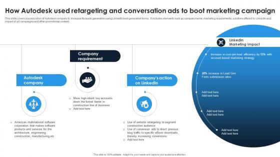 This slide covers success story of Autodesk company to increase its leads generation using LinkedIn lead generation forms . It includes elements such as company name, marketing requirements, solutions offered by LinkedIn and impact of ad campaigns and other promotional content. Do you have an important presentation coming up Are you looking for something that will make your presentation stand out from the rest Look no further than Linkedin Content Strategies How Autodesk Used Retargeting And Conversation MKT SS V. With our professional designs, you can trust that your presentation will pop and make delivering it a smooth process. And with Slidegeeks, you can trust that your presentation will be unique and memorable. So why wait Grab Linkedin Content Strategies How Autodesk Used Retargeting And Conversation MKT SS V today and make your presentation stand out from the rest This slide covers success story of Autodesk company to increase its leads generation using LinkedIn lead generation forms . It includes elements such as company name, marketing requirements, solutions offered by LinkedIn and impact of ad campaigns and other promotional content.