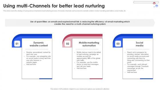 This slide covers the strategy of using various channels to lead nurturing process. It includes channels such as dynamic website content, mobile marketing automation, social media, etc. This modern and well-arranged Using Multi Channels For Better Lead Nurturing Various Techniques For Managing Rules PDF provides lots of creative possibilities. It is very simple to customize and edit with the Powerpoint Software. Just drag and drop your pictures into the shapes. All facets of this template can be edited with Powerpoint, no extra software is necessary. Add your own material, put your images in the places assigned for them, adjust the colors, and then you can show your slides to the world, with an animated slide included. This slide covers the strategy of using various channels to lead nurturing process. It includes channels such as dynamic website content, mobile marketing automation, social media, etc.