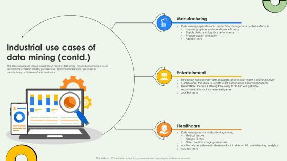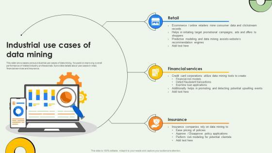 This slide showcases various industrial use cases of data mining, focused on improving overall performance of related industry professionals. It provides details about use cases in retail, financial services and insurance. Explore a selection of the finest Industrial Use Cases Of Data Mining Using Data Mining Tools To Optimize Processes AI SS V here. With a plethora of professionally designed and pre-made slide templates, you can quickly and easily find the right one for your upcoming presentation. You can use our Industrial Use Cases Of Data Mining Using Data Mining Tools To Optimize Processes AI SS V to effectively convey your message to a wider audience. Slidegeeks has done a lot of research before preparing these presentation templates. The content can be personalized and the slides are highly editable. Grab templates today from Slidegeeks. This slide showcases various industrial use cases of data mining, focused on improving overall performance of related industry professionals. It provides details about use cases in retail, financial services and insurance.
