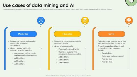 This slide showcases key applications of artificial intelligence and data mining combined which can help identical industries automate their data related tasks. It provides details about marketing, education, travel, etc. The Use Cases Of Data Mining And AI Using Data Mining Tools To Optimize Processes AI SS V is a compilation of the most recent design trends as a series of slides. It is suitable for any subject or industry presentation, containing attractive visuals and photo spots for businesses to clearly express their messages. This template contains a variety of slides for the user to input data, such as structures to contrast two elements, bullet points, and slides for written information. Slidegeeks is prepared to create an impression. This slide showcases key applications of artificial intelligence and data mining combined which can help identical industries automate their data related tasks. It provides details about marketing, education, travel, etc.