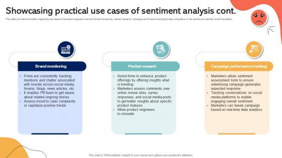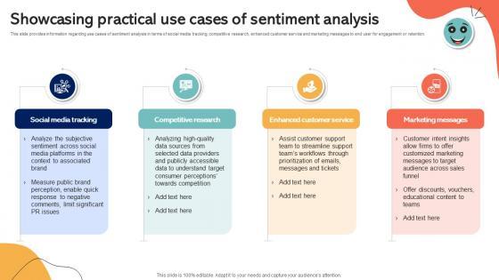This slide provides information regarding use cases of sentiment analysis in terms of social media tracking, competitive research, enhanced customer service and marketing messages to end user for engagement or retention. Are you in need of a template that can accommodate all of your creative concepts This one is crafted professionally and can be altered to fit any style. Use it with Google Slides or PowerPoint. Include striking photographs, symbols, depictions, and other visuals. Fill, move around, or remove text boxes as desired. Test out color palettes and font mixtures. Edit and save your work, or work with colleagues. Download Showcasing Practical Use Cases Of Sentiment Analysis Emotionally Intelligent Insights Leveraging AI SS V and observe how to make your presentation outstanding. Give an impeccable presentation to your group and make your presentation unforgettable. This slide provides information regarding use cases of sentiment analysis in terms of social media tracking, competitive research, enhanced customer service and marketing messages to end user for engagement or retention.