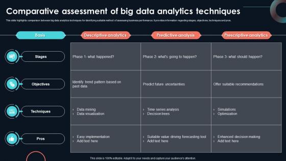 This slide highlights comparison between big data analytics techniques for identifying suitable method of assessing business performance. It provides information regarding stages, objectives, techniques and pros. Coming up with a presentation necessitates that the majority of the effort goes into the content and the message you intend to convey. The visuals of a PowerPoint presentation can only be effective if it supplements and supports the story that is being told. Keeping this in mind our experts created Comparative Assessment Of Big Data Developing Strategic Insights Using Big Data Analytics SS V to reduce the time that goes into designing the presentation. This way, you can concentrate on the message while our designers take care of providing you with the right template for the situation. This slide highlights comparison between big data analytics techniques for identifying suitable method of assessing business performance. It provides information regarding stages, objectives, techniques and pros.