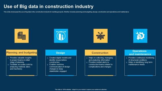 This slide showcases the use of big data in the construction industry for building projects. It further includes planning and budgeting, design, construction and operations and maintenance. Pitch your topic with ease and precision using this Use Of Big Data In Construction Industry Ppt Visual Aids Infographics pdf. This layout presents information on Planning And Budgeting, Design Construction, Operations And Maintenance. It is also available for immediate download and adjustment. So, changes can be made in the color, design, graphics or any other component to create a unique layout. This slide showcases the use of big data in the construction industry for building projects. It further includes planning and budgeting, design, construction and operations and maintenance.