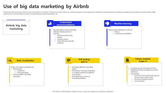 Following slide showcases Airbnbs uses of big data in marketing. The purpose of this slide is to assist businesses in leveraging new methods for enhancing their marketing campaigns and providing customers with a better experience. It includes tactics such as machine learning, data visualization, etc. Showcasing this set of slides titled Use Of Big Data Marketing By Airbnb Ppt Portfolio Deck PDF. The topics addressed in these templates are Better Experience, Machine Learning, Data Visualization. All the content presented in this PPT design is completely editable. Download it and make adjustments in color, background, font etc. as per your unique business setting. Following slide showcases Airbnbs uses of big data in marketing. The purpose of this slide is to assist businesses in leveraging new methods for enhancing their marketing campaigns and providing customers with a better experience. It includes tactics such as machine learning, data visualization, etc.
