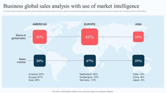 The slide outlines analysis of total sales volume and share of global sales by country to determine most growing geographic area and determine which regions requires more marketing and promotional efforts. Boost your pitch with our creative Business Global Sales Analysis With Use Of Execution Of Strategic Intelligence Brochure PDF. Deliver an awe-inspiring pitch that will mesmerize everyone. Using these presentation templates you will surely catch everyones attention. You can browse the ppts collection on our website. We have researchers who are experts at creating the right content for the templates. So you do not have to invest time in any additional work. Just grab the template now and use them. The slide outlines analysis of total sales volume and share of global sales by country to determine most growing geographic area and determine which regions requires more marketing and promotional efforts.