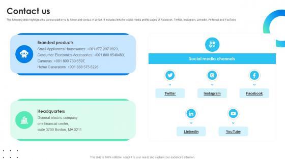 The following slide highlights the various platforms to follow and contact Walmart. It includes links for social media profile pages of Facebook, Twitter, Instagram, LinkedIn, Pinterest and YouTube. From laying roadmaps to briefing everything in detail, our templates are perfect for you. You can set the stage with your presentation slides. All you have to do is download these easy-to-edit and customizable templates. Contact Us Global Energy Company Profile PPT Example CP SS V will help you deliver an outstanding performance that everyone would remember and praise you for. Do download this presentation today. The following slide highlights the various platforms to follow and contact Walmart. It includes links for social media profile pages of Facebook, Twitter, Instagram, LinkedIn, Pinterest and YouTube