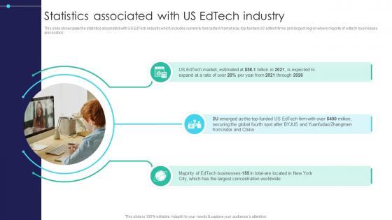 This slide showcases the statistics associated with US EdTech industry which includes current and forecasted market size, top-funded US edtech firms and largest region where majority of edtech businesses are located. Want to ace your presentation in front of a live audience Our Global Digital Education Statistics Associated With Us Edtech Industry IR SS V can help you do that by engaging all the users towards you. Slidegeeks experts have put their efforts and expertise into creating these impeccable powerpoint presentations so that you can communicate your ideas clearly. Moreover, all the templates are customizable, and easy-to-edit and downloadable. Use these for both personal and commercial use. This slide showcases the statistics associated with US EdTech industry which includes current and forecasted market size, top-funded US edtech firms and largest region where majority of edtech businesses are located.