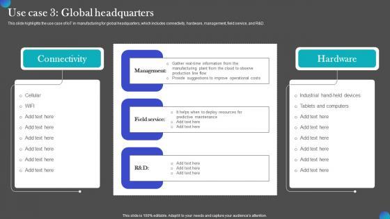 This slide highlights the use case of IoT in manufacturing for global headquarters, which includes connectivity, hardware, management, field service, and R and D. Take your projects to the next level with our ultimate collection of Use Case 3 Global Headquarters IOT Adoption Manufacturing Summary PDF. Slidegeeks has designed a range of layouts that are perfect for representing task or activity duration, keeping track of all your deadlines at a glance. Tailor these designs to your exact needs and give them a truly corporate look with your own brand colors they will make your projects stand out from the rest This slide highlights the use case of IoT in manufacturing for global headquarters, which includes connectivity, hardware, management, field service, and RandD.