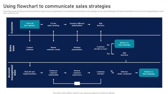 This slide provides glimpse about a flowchart that can help a business organization to communicate and channelize its sales strategies across major stakeholders. It includes stakeholders such as account management team, sales team, customers, etc. Get a simple yet stunning designed Using Flowchart To Communicate Sales Strategies Strategic Sales Plan To Enhance Information Pdf. It is the best one to establish the tone in your meetings. It is an excellent way to make your presentations highly effective. So, download this PPT today from Slidegeeks and see the positive impacts. Our easy-to-edit Using Flowchart To Communicate Sales Strategies Strategic Sales Plan To Enhance Information Pdf can be your go-to option for all upcoming conferences and meetings. So, what are you waiting for Grab this template today. This slide provides glimpse about a flowchart that can help a business organization to communicate and channelize its sales strategies across major stakeholders. It includes stakeholders such as account management team, sales team, customers, etc.