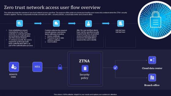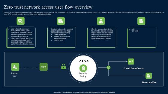 This slide describes the overview of zero trust network access user flow. The purpose of this slide is to showcase how the user moves into a network when the ZTNA security model is applied. The key components include a remote user, MFA, security policies, a cloud data center and a branch office. Retrieve professionally designed Zero Trust Model Zero Trust Network Access User Flow Overview to effectively convey your message and captivate your listeners. Save time by selecting pre-made slideshows that are appropriate for various topics, from business to educational purposes. These themes come in many different styles, from creative to corporate, and all of them are easily adjustable and can be edited quickly. Access them as PowerPoint templates or as Google Slides themes. You do not have to go on a hunt for the perfect presentation because Slidegeeks got you covered from everywhere. This slide describes the overview of zero trust network access user flow. The purpose of this slide is to showcase how the user moves into a network when the ZTNA security model is applied. The key components include a remote user, MFA, security policies, a cloud data center and a branch office.