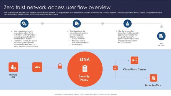 This slide describes the overview of zero trust network access user flow. The purpose of this slide is to showcase how the user moves into a network when the ZTNA security model is applied. The key components include a remote user, MFA, security policies, a cloud data center and a branch office. Slidegeeks is here to make your presentations a breeze with Zero Trust Network Access User Flow Overview Download Pdf With our easy-to-use and customizable templates, you can focus on delivering your ideas rather than worrying about formatting. With a variety of designs to choose from, you are sure to find one that suits your needs. And with animations and unique photos, illustrations, and fonts, you can make your presentation pop. So whether you are giving a sales pitch or presenting to the board, make sure to check out Slidegeeks first This slide describes the overview of zero trust network access user flow. The purpose of this slide is to showcase how the user moves into a network when the ZTNA security model is applied. The key components include a remote user, MFA, security policies, a cloud data center and a branch office.