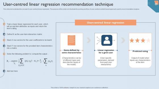 This slide demonstrates the concept of user-centred linear regression. The purpose of this slide is to illustrate the working and flow of user-centred content based approach used by recommendation engines.This User Centred Linear Regression Recommendation Technique Integrating Recommender System To Enhance Topics PDF from Slidegeeks makes it easy to present information on your topic with precision. It provides customization options, so you can make changes to the colors, design, graphics, or any other component to create a unique layout. It is also available for immediate download, so you can begin using it right away. Slidegeeks has done good research to ensure that you have everything you need to make your presentation stand out. Make a name out there for a brilliant performance.