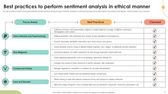 This slide provides information regarding essential best practices that help in the ethical usage of sentiment analysis by considering focus areas such as data collection, preprocessing, bias mitigation, context and polarity, irony, or sarcasm. There are so many reasons you need a Best Practices To Perform Sentiment Analysis Decoding User Emotions In Depth Exploration AI SS V. The first reason is you can not spend time making everything from scratch, Thus, Slidegeeks has made presentation templates for you too. You can easily download these templates from our website easily. This slide provides information regarding essential best practices that help in the ethical usage of sentiment analysis by considering focus areas such as data collection, preprocessing, bias mitigation, context and polarity, irony, or sarcasm.