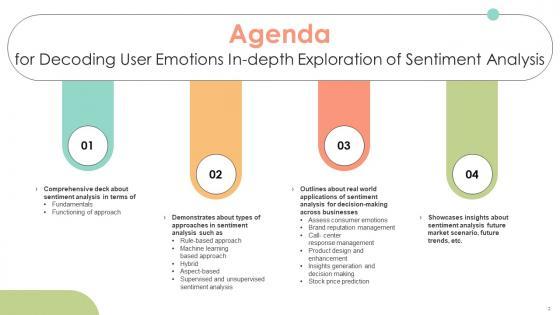Boost your pitch with our creative Agenda For Decoding User Emotions In Depth Exploration Of Sentiment Analysis AI SS V. Deliver an awe-inspiring pitch that will mesmerize everyone. Using these presentation templates you will surely catch everyones attention. You can browse the ppts collection on our website. We have researchers who are experts at creating the right content for the templates. So you do not have to invest time in any additional work. Just grab the template now and use them. Our Agenda For Decoding User Emotions In Depth Exploration Of Sentiment Analysis AI SS V are topically designed to provide an attractive backdrop to any subject. Use them to look like a presentation pro.