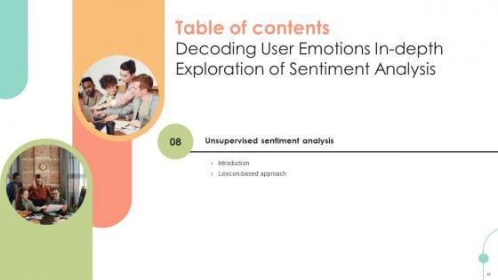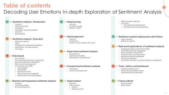 Crafting an eye-catching presentation has never been more straightforward. Let your presentation shine with this tasteful yet straightforward Table Of Contents Decoding User Emotions In Depth Exploration Of Sentiment Analysis AI SS V template. It offers a minimalistic and classy look that is great for making a statement. The colors have been employed intelligently to add a bit of playfulness while still remaining professional. Construct the ideal Table Of Contents Decoding User Emotions In Depth Exploration Of Sentiment Analysis AI SS V that effortlessly grabs the attention of your audience Begin now and be certain to wow your customers Our Table Of Contents Decoding User Emotions In Depth Exploration Of Sentiment Analysis AI SS V are topically designed to provide an attractive backdrop to any subject. Use them to look like a presentation pro.