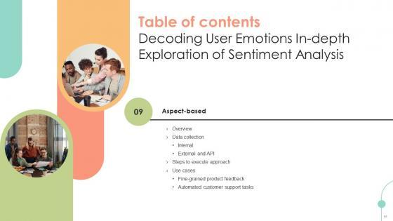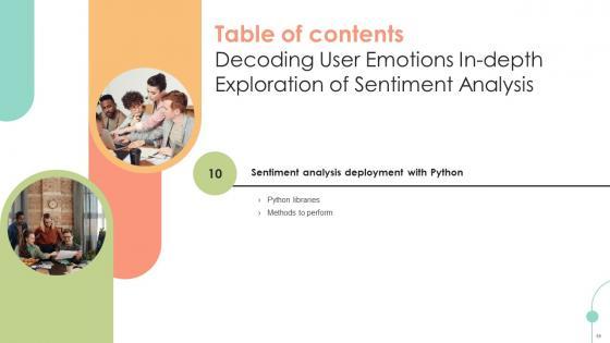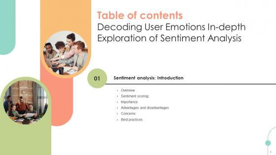 Make sure to capture your audiences attention in your business displays with our gratis customizable Table Of Contents For Decoding User Emotions In Depth Exploration Of Sentiment Analysis AI SS V. These are great for business strategies, office conferences, capital raising or task suggestions. If you desire to acquire more customers for your tech business and ensure they stay satisfied, create your own sales presentation with these plain slides. Our Table Of Contents For Decoding User Emotions In Depth Exploration Of Sentiment Analysis AI SS V are topically designed to provide an attractive backdrop to any subject. Use them to look like a presentation pro.