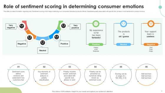 This slide provides information regarding role of sentiment scoring which helps in detecting how consumers feel about products offered. It assesses polarity associated with specific text, phrase or word mentioned in product reviews. Slidegeeks is here to make your presentations a breeze with Role Of Sentiment Scoring In Determining Decoding User Emotions In Depth Exploration AI SS V With our easy-to-use and customizable templates, you can focus on delivering your ideas rather than worrying about formatting. With a variety of designs to choose from, you are sure to find one that suits your needs. And with animations and unique photos, illustrations, and fonts, you can make your presentation pop. So whether you are giving a sales pitch or presenting to the board, make sure to check out Slidegeeks first This slide provides information regarding role of sentiment scoring which helps in detecting how consumers feel about products offered. It assesses polarity associated with specific text, phrase or word mentioned in product reviews.