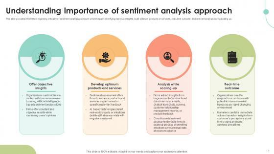 This slide provides information regarding criticality of sentiment analysis approach which helps in identifying objective insights, build optimum products or services, real time outcome, and relevant analysis during scaling up. Formulating a presentation can take up a lot of effort and time, so the content and message should always be the primary focus. The visuals of the PowerPoint can enhance the presenters message, so our Understanding Importance Of Sentiment Decoding User Emotions In Depth Exploration AI SS V was created to help save time. Instead of worrying about the design, the presenter can concentrate on the message while our designers work on creating the ideal templates for whatever situation is needed. Slidegeeks has experts for everything from amazing designs to valuable content, we have put everything into Understanding Importance Of Sentiment Decoding User Emotions In Depth Exploration AI SS V This slide provides information regarding criticality of sentiment analysis approach which helps in identifying objective insights, build optimum products or services, real time outcome, and relevant analysis during scaling up.