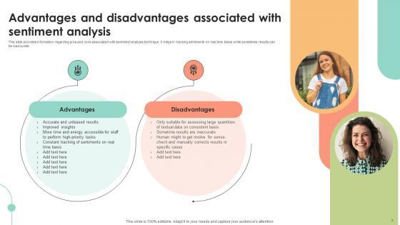 This slide provides information regarding pros and cons associated with sentiment analysis technique. It helps in tracking sentiments on real time basis while sometimes results can be inaccurate. Find a pre-designed and impeccable Advantages And Disadvantages Associated Decoding User Emotions In Depth Exploration AI SS V. The templates can ace your presentation without additional effort. You can download these easy-to-edit presentation templates to make your presentation stand out from others. So, what are you waiting for Download the template from Slidegeeks today and give a unique touch to your presentation. This slide provides information regarding pros and cons associated with sentiment analysis technique. It helps in tracking sentiments on real time basis while sometimes results can be inaccurate.